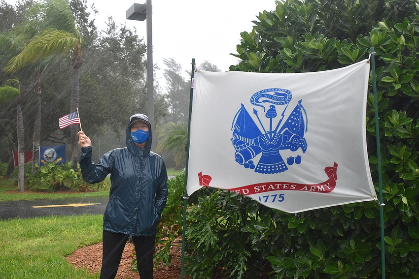 The small group of volunteers stayed at the circle drive on Bay Isles Road as the rain came down and wind threatened to uproot the flags of the branches of the military (there was even one for the newly formed Space Force).