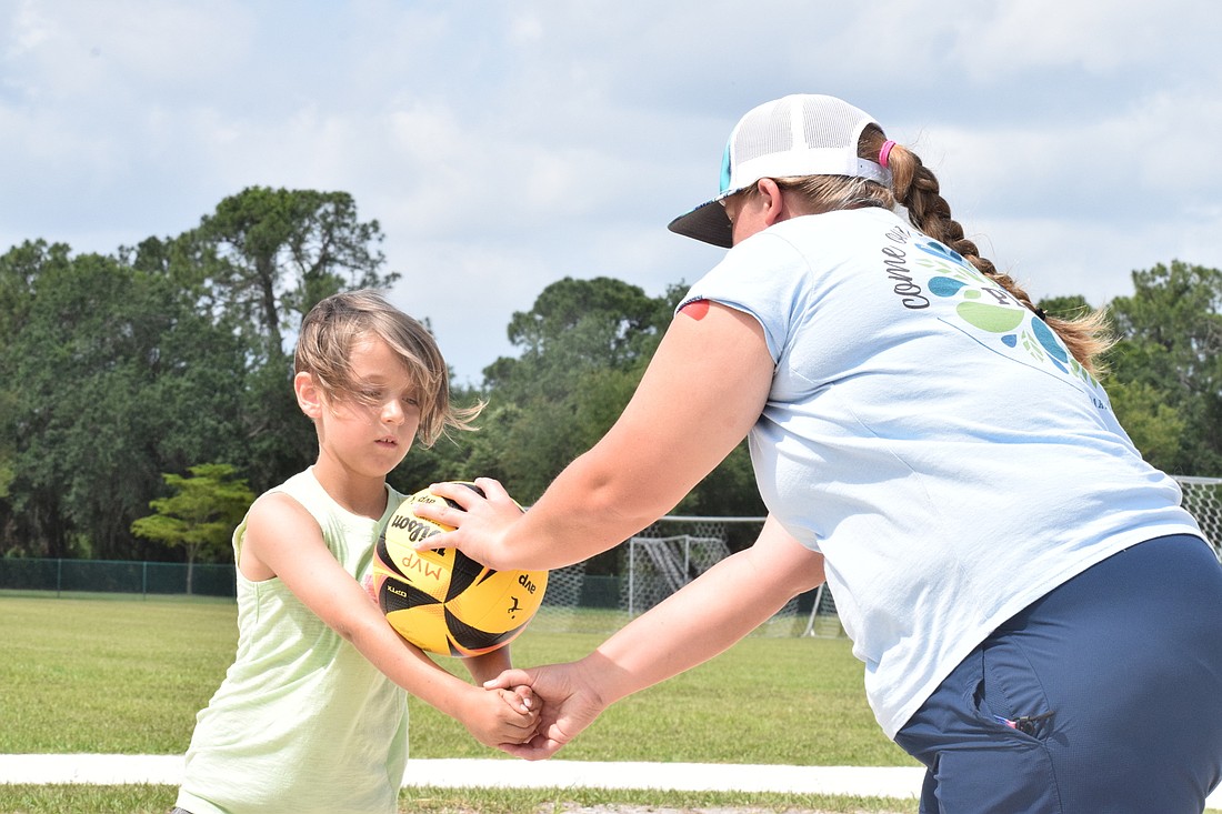 Central Park's Aunders Lyon, 7, listens as volleyball Coach Hayley Buchanan shows him where he wants the ball to hit his arms so he can have control over the direction of his pass.