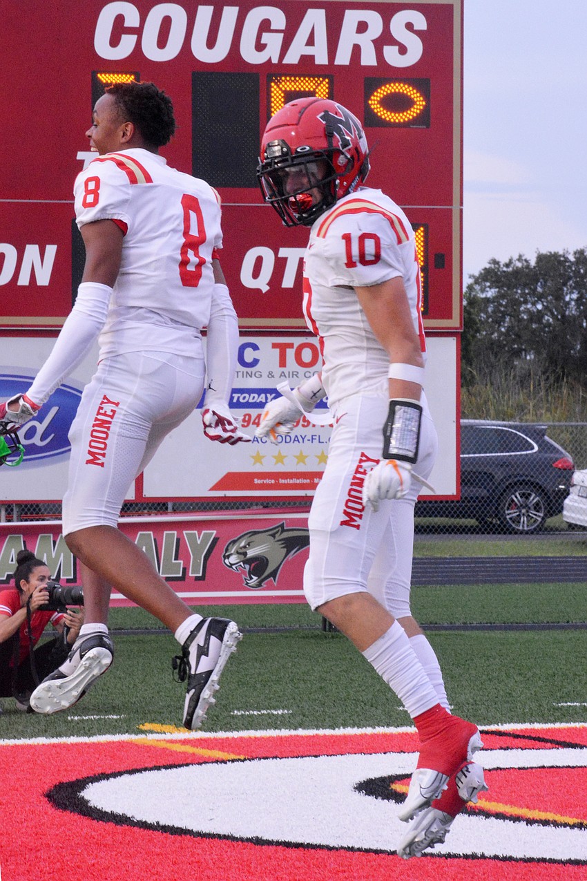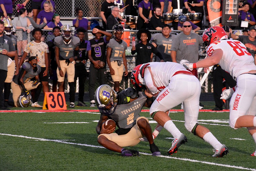 Mooney's defense seized the first opportunity it got to make an impact play. With Booker backed deep in its own zone, the Tornadoes had a low snap that sent quarterback Will Carter Jr. into his own end zone to retrieve the ball. By the time he did, the Cougars defense was on top of him, tackling him for a safety. On the ensuing kickoff, Mooney junior Griffin Gisotti scampered down the left side of the field untouched for a score. An encroachment penalty on the extra-point attempt put Mooney in position to go for two instead, and junior running back Carson Beach converted, making the score 10-0.Â