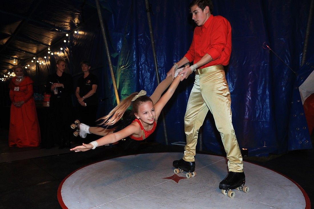 The night's circus performance started with an aerial act from gala co-chairwomen Donna Koffman and Elisabeth Waters along with Chaz Glunk. Circus Arts Conservatory students dazzled the audience with aerial lyra acts, Elayne Kramer twisted her body in complex hand balancing routines and the night even had a surprise performance from Sarasota favorite Bello Nock.Â