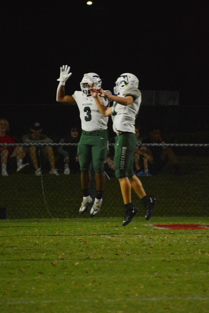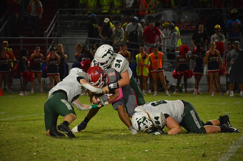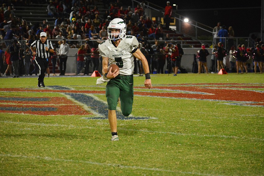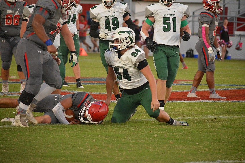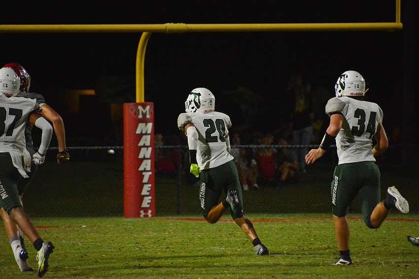 Lakewood Ranch's defense bolstered its offense in the first half. Senior defensive tackle Cameron Caudill fell on a fumble on Manatee's first possession, setting up a four-yard touchdown run by senior Kevin Everhart that gave the Mustangs a 7-0 lead. After Manatee rebounded and led 14-7, Mustangs sophomore Trey Schwartz picked off a pass and scored, though the extra point was blocked. The Mustangs' biggest offensive play of the game was Everhart's 79-yard touchdown run in the second quarter, which gave Lakewood Ranch its halftime lead.Â