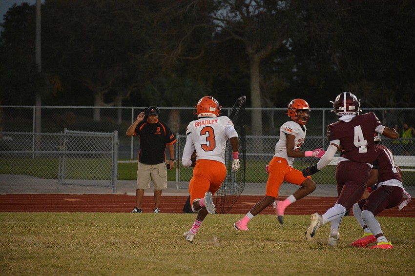 It started when Sailors sophomore quarterback Alexander Diaz found senior wideout Caleb Bradley on a crossing pattern, which Bradley took 56 yards for a score. In the second quarter, Sarasota junior defensive back Joshua DeCrapio picked off Braden River junior quarterback Nick Trier on the Sailors 21 yard line. A few plays later, Sailors sophomore running back Takurian Smith ran in a score from five yards out. The Pirates would get on the board before halfitme when sophomore kicker Bruno Reus hit a 38 yard field goal.