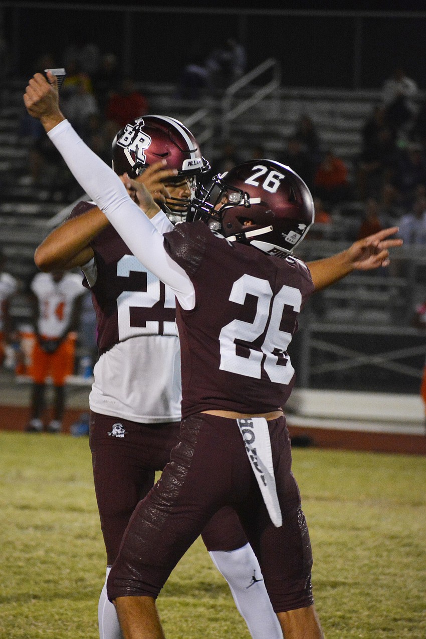 Sarasota then-juniors Jackson Mullet (9) and Kyser Bordones (24) celebrate a Bordones pick six against Braden River in 2022. Both players should contribute as seniors in 2023.