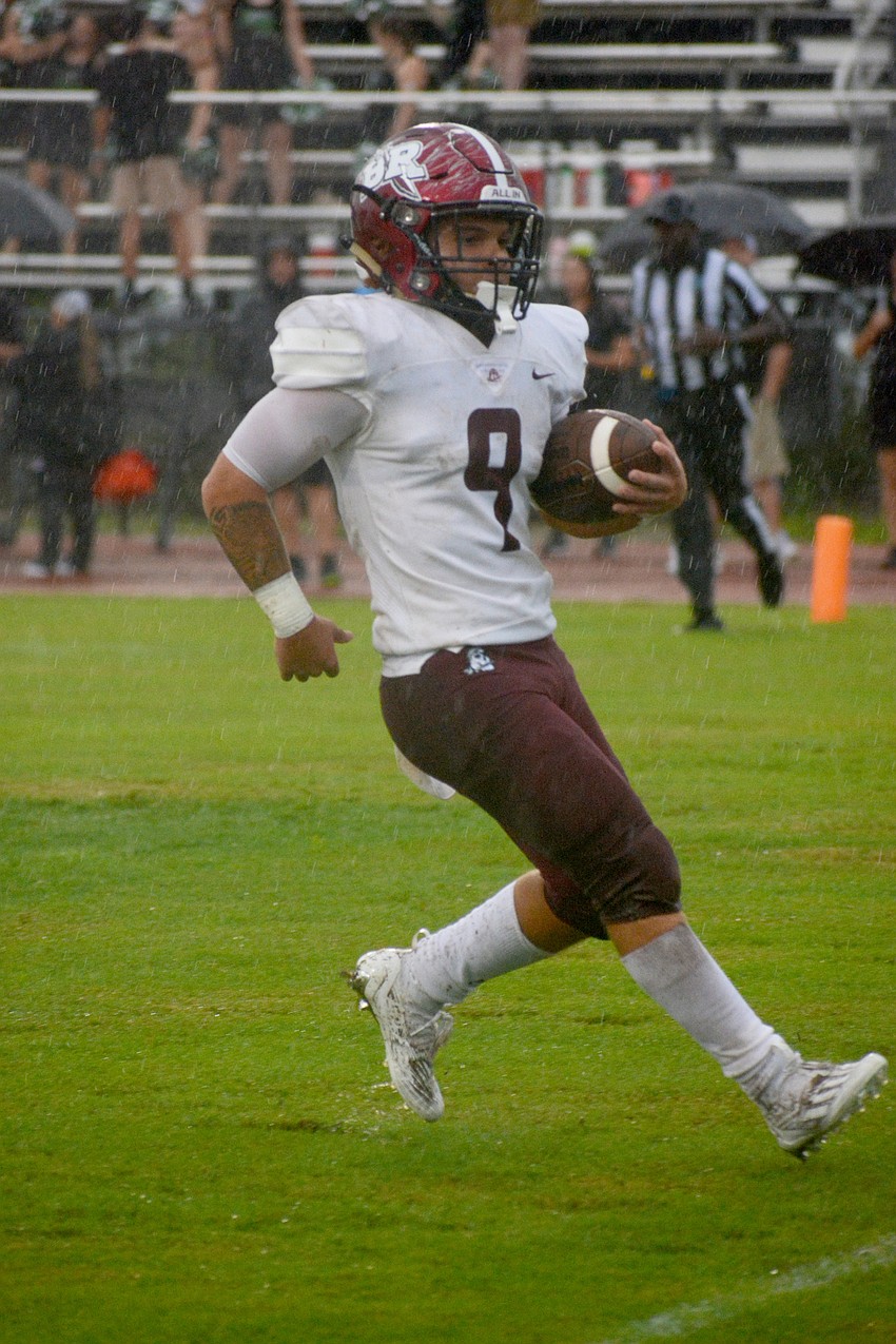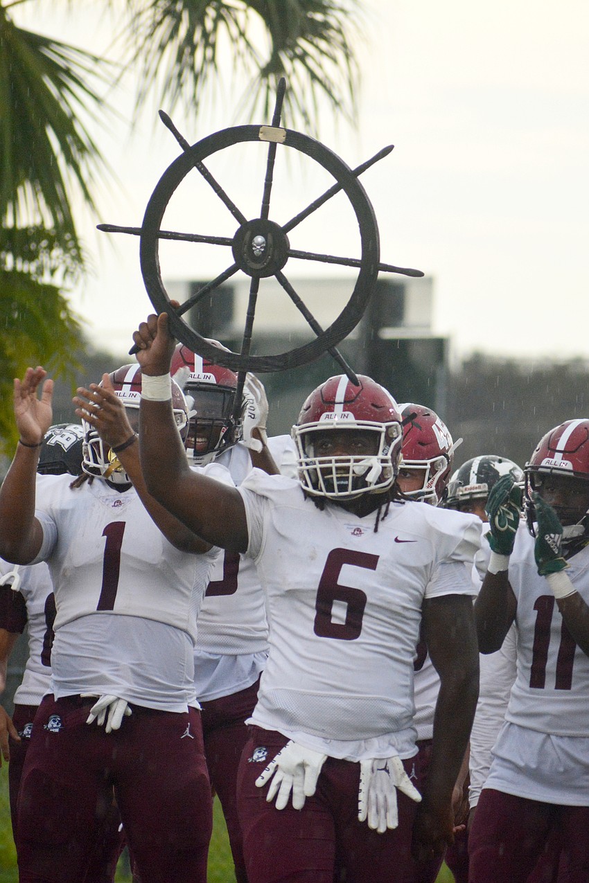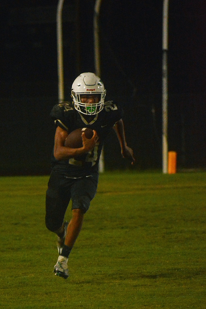 Pirates junior running back Trayvon Pinder ran for three touchdowns and senior running back Roy Burchett ran for one. The Pirates also recovered a Mustangs fumble in the end zone for a score. Everhart had both Mustangs scores.Â