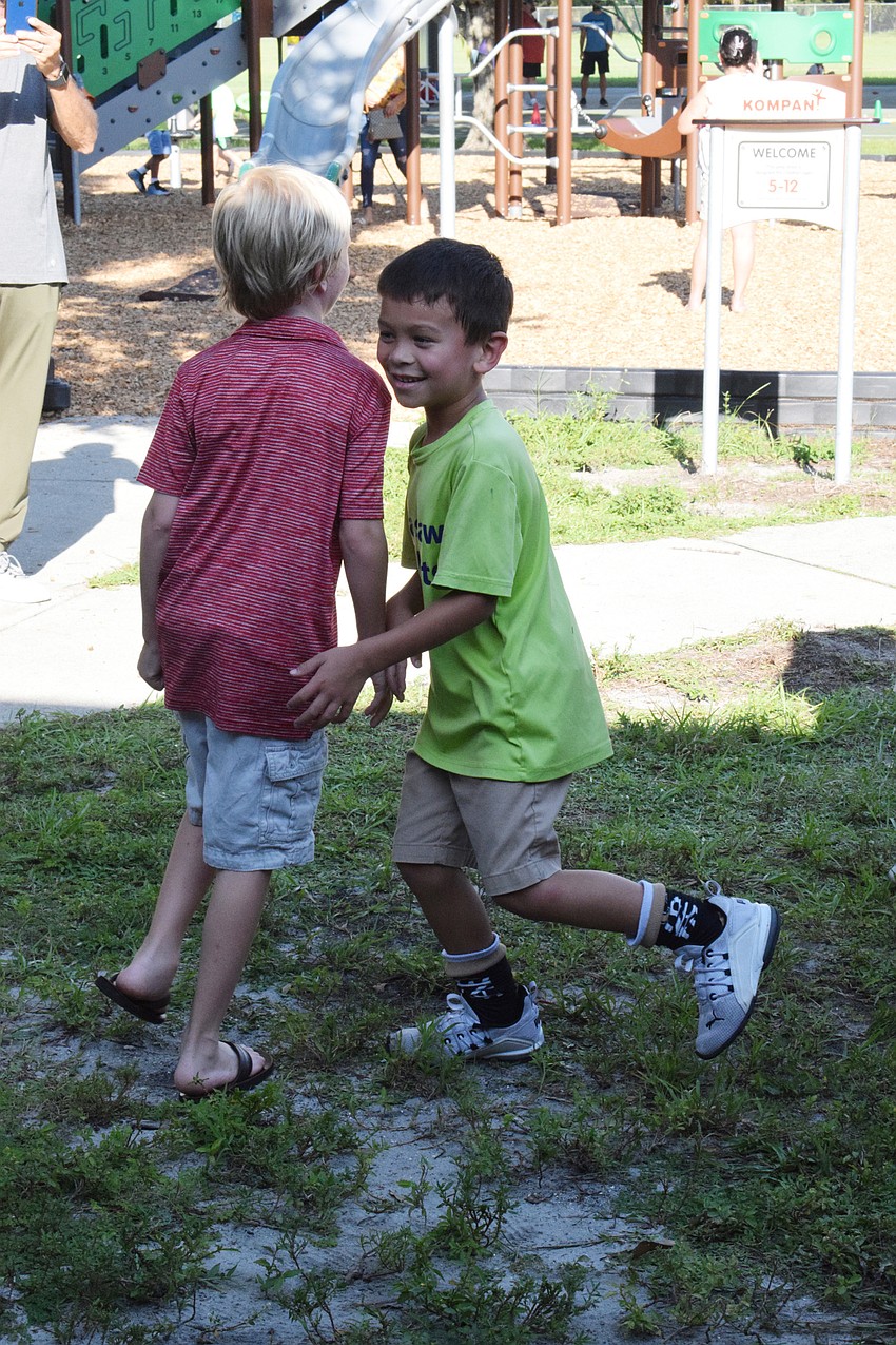 Lisa Clayton watched as her grandchildren Marley Miller and Lee Miller participated in a physical education activity that had them practicing how to say colors in Spanish.