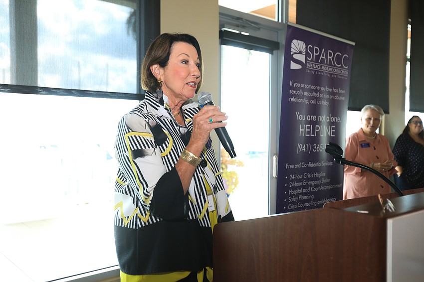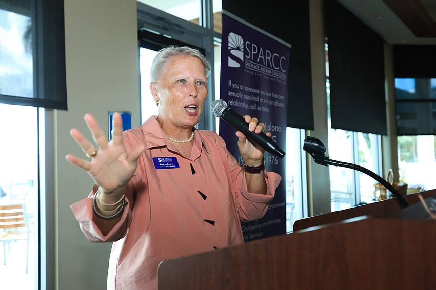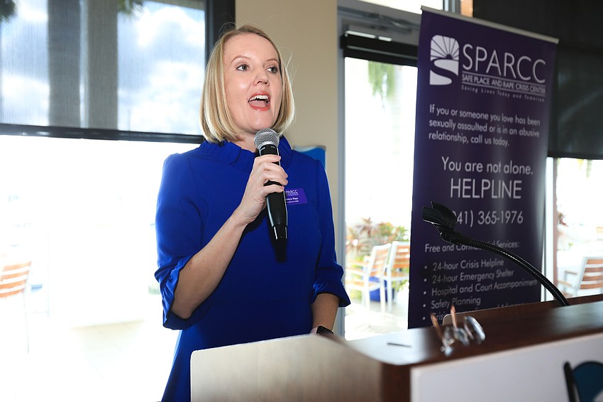 SPARCC President & CEO Jessica Hays thanked the audience for attending and brought up the importance of coming SPARCC events — including a card and game party, a gold tournament, a holiday luncheon and the annual gala — and how they provide funding for the organization's work helping abused people.
