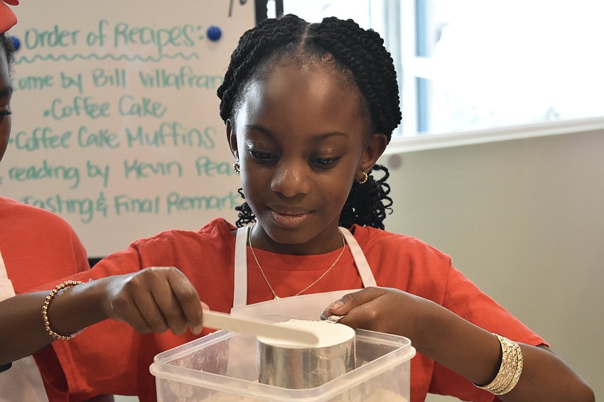 Arianny, a sixth grader, measures out an ingredient for the cakes.