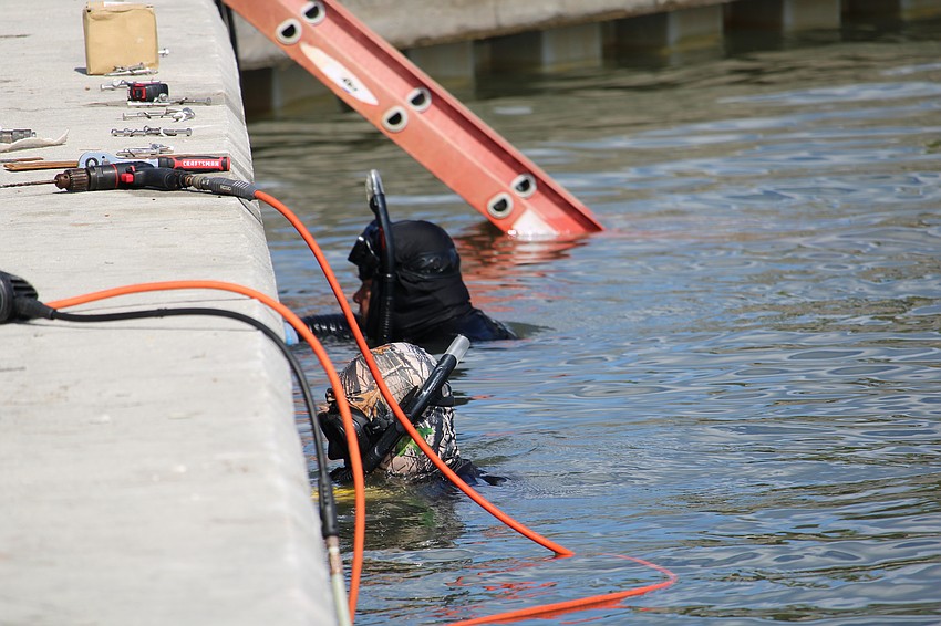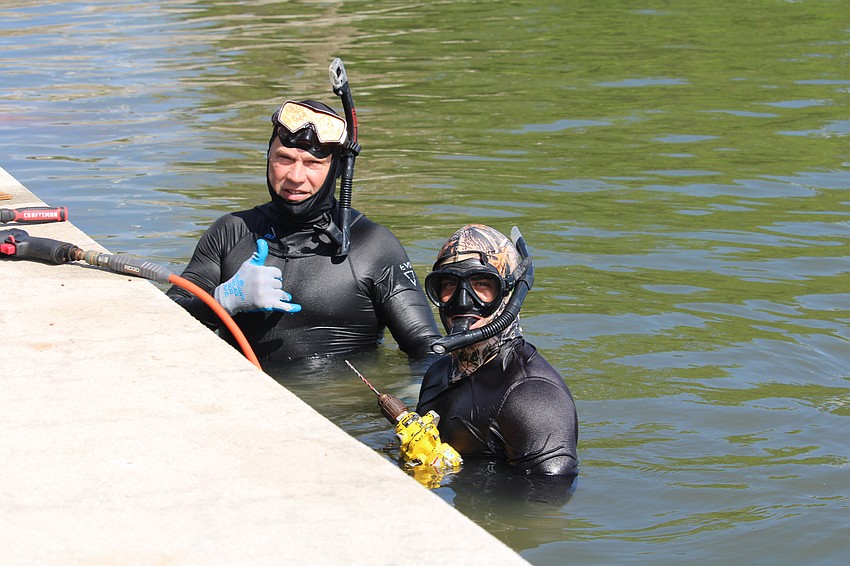 Julio Ramos and Alex Burgos work with the high tide to install the "living wall" panels along Sarasota Bay. They have been working row by row, and they'll put their diving skills to the test to install the furthest ones down.