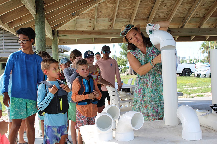 Youth members of Sarasota Youth Sailing joined the Rotary on City Island at the Sarasota Sailing Squadron headquarters to glue together PVC pipes to make the recycling bins. Anyone who collects the line can place it in the pipe, the opening of which is covered with a simple rubber flap. Then, disposal teams can simply open the bottom and take away the line for recycling.