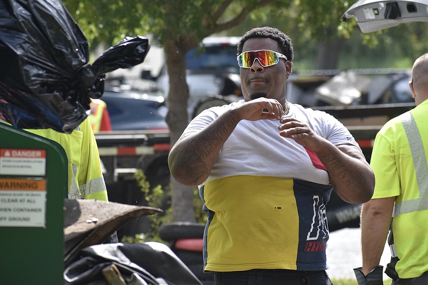 Instead of being subjected to the force of a hurricane, the materials were being compacted that day, Aug. 23, as they were flung into a large dumpster.