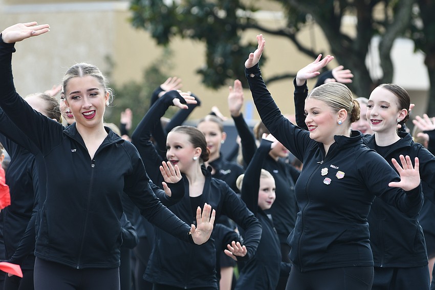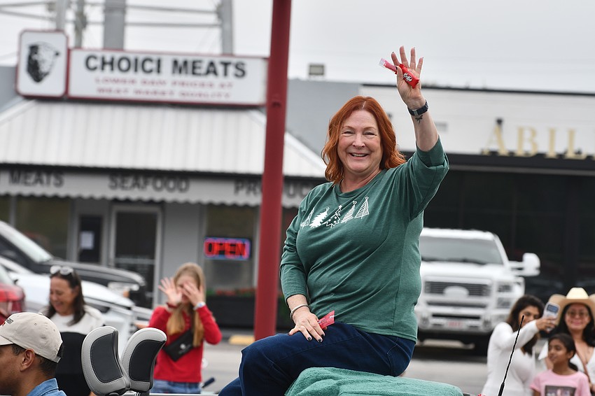 Cheerleaders from Sarasota High School wave to the crowds.