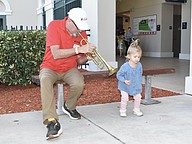 John Castleman of the Venice Symphony Orchestra plays trumpet for Audrey Locken, 1.