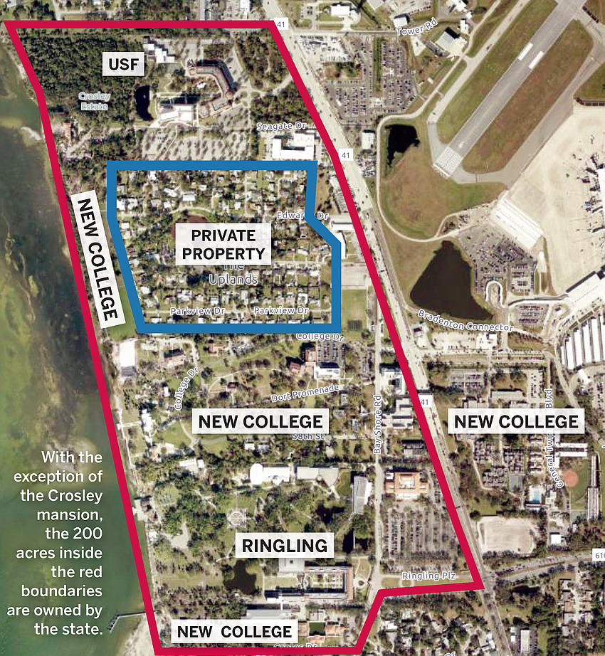 At the southern end of Uplands, you will come upon New College of Florida — its approximately 100 total acres stretching from the bay on the west and across Tamiami Trail to the east to the airport and including the late Charles Ringling’s beautiful bayfront mansion.