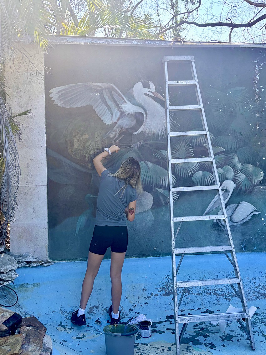 Artist Annie Joy refurbished the piece, bringing back the blush of the roseate spoonbill and sapphire spark of the great blue heron pictured in the mural.