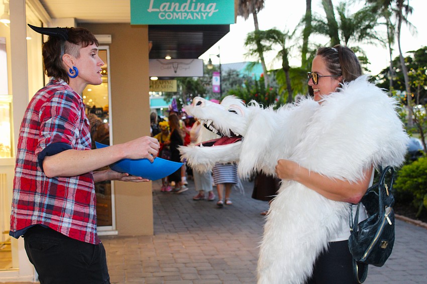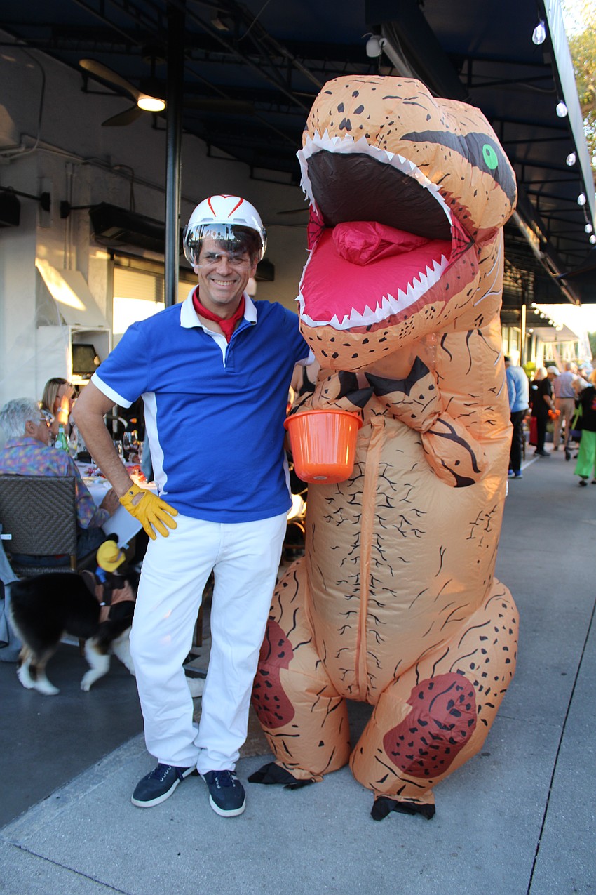 They do move in herds on St. Armands Circle, where Brian Berry and Beth Pavlicberry ride their dinosaurs through the festivities for Fright Night on St. Armands Circle.