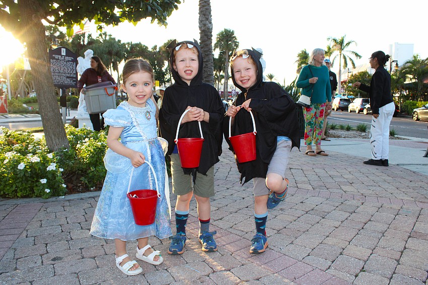 Rosie Dines as Cinderella and Jack and Harry Whittles as a pair of fearsome bats do some early trick-or-treating at Fright Night on St. Armands Circle.