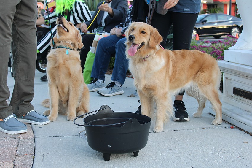 Lily and Leo the golden retrievers help hand out candy for Fright Night on St. Armands Circle.