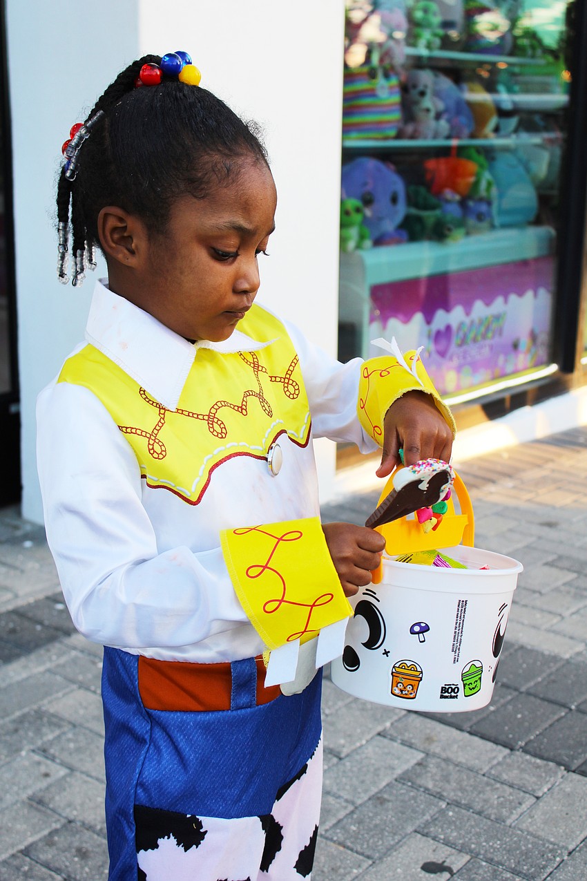 Vacea Lea attentively inspects her trick-or-treating goodies from Fright Night on St. Armands Circle.