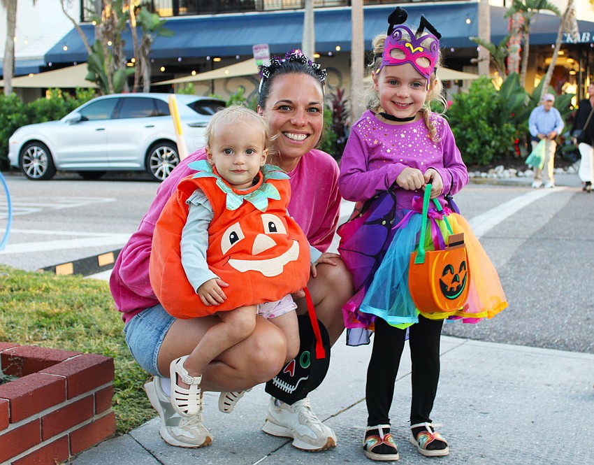 Sarah Cameron takes Freya — a colorful butterfly — and Anna — a grinning pumpkin — out for trick-or-treating at Fright Night on St. Armands Circle.