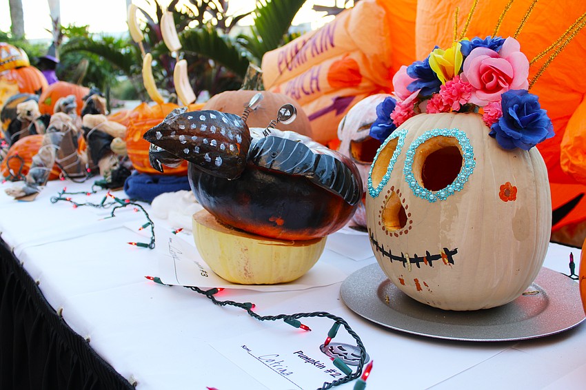 Spooky pumpkin faces peer out at passersby along the busy block in front of the Crab & Fin restaurant on Fright Night on St. Armands Circle.