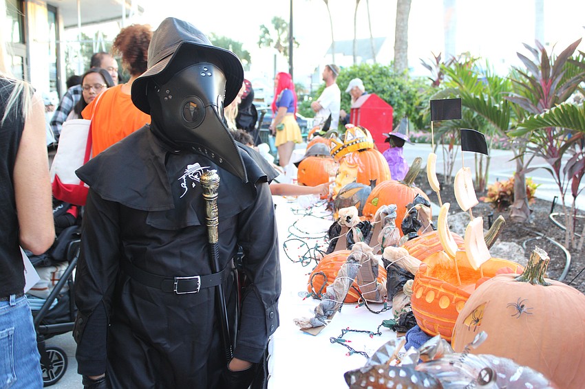 Kyle Garcia-Celis sports an impressive plague doctor costume while checking out the jack-o-lanterns at Fright Night on St. Armands Circle.