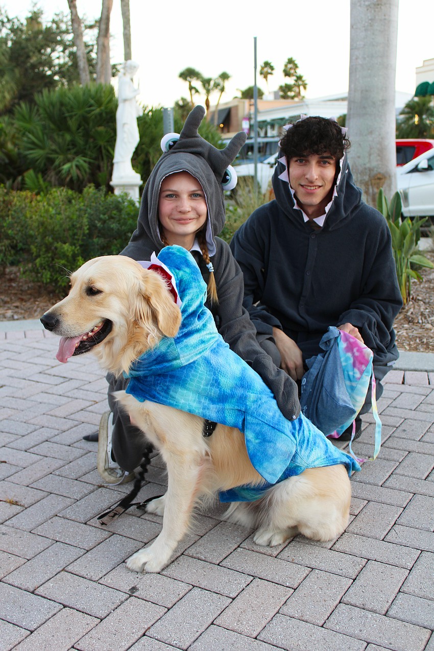 Finn, the 2-year-old golden retriever, fittingly wears his shark costume to accompany Jack Guttman and Alexis Barr — respectively dressed as a shark and a ray — for Fright Night on St. Armands Circle.