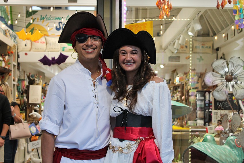 Trick-or-treaters narrowly avoid walking the plank when getting candy from pirates Blake Kincaid and Megan Ponce at Fright Night on St. Armands Circle.