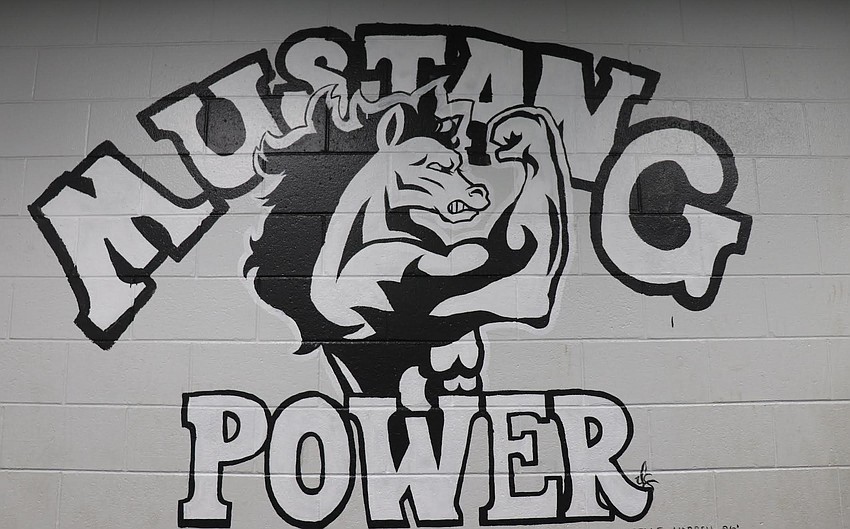 Other murals can be seen in the weightlifting room and in the Mustangs Ahead podcast room. The latter is an ongoing project.