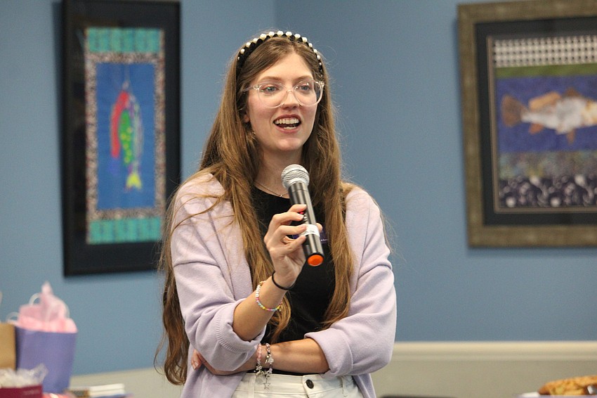 Club members invited Casey to speak at Fruitville Library on Sept. 30 for their Day of Service. They also presented the $1,400 that members collected, along with items to donate for survivors, including cell phones, diapers, hygiene kits and more.