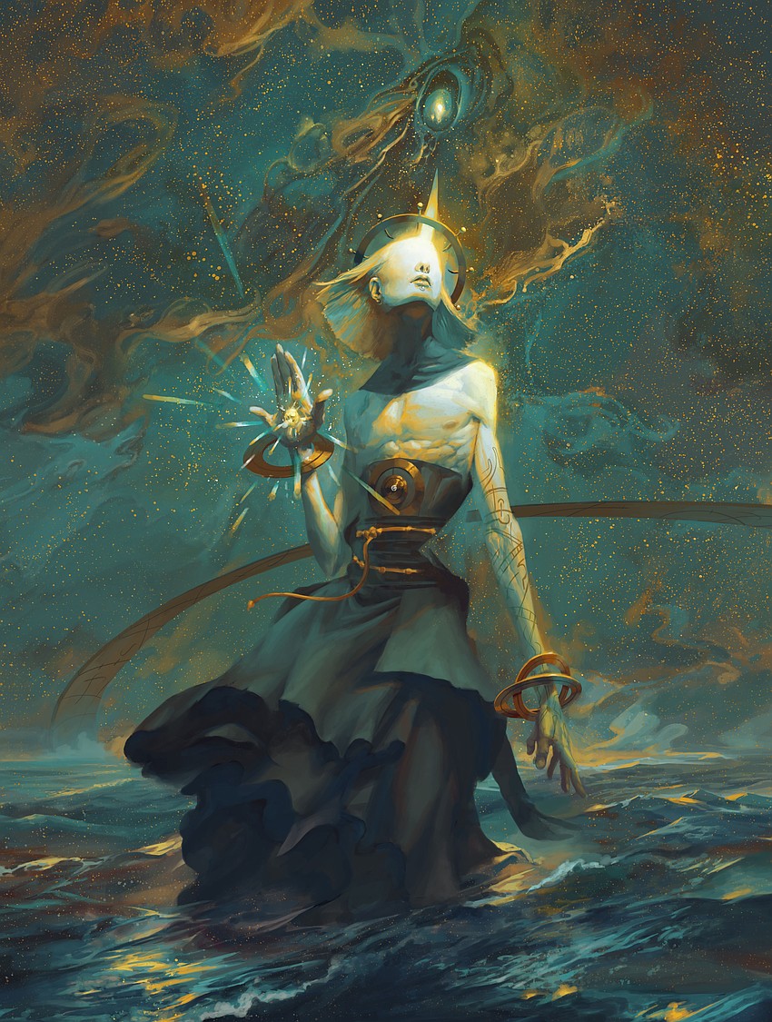 The Bible’s descriptions of angels don’t resemble the fluffy effigies found on top of Christmas trees. Swirling vortices of wings and eyes — that’s more like it. They’re weird, otherworldly, unsafe, not fluffy at all. Peter Mohrbacher’s angels fit that description. His entities are ethereal, enigmatic and terrifyingly beautiful. Mohrbacher’s “Armaros” (2025) is a towering, bruised, multi-armed figure wrapped in black cords. It looms against a shattered obelisk carved with arcane runes. The entity’s head tilts back in a grimace of rapture/torment. A violet background of misty mountains. A crimson foreground — glowing like a brushfire in the uncanny valley. A beautiful being. But dangerous.