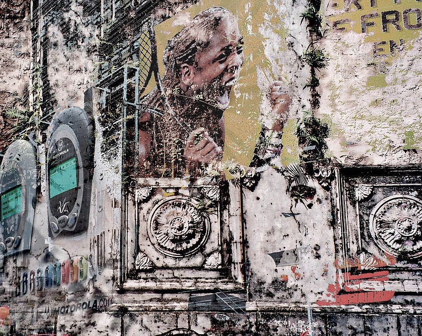 Thomas Carabasi is a multidisciplinary artist and a retired Ringling professor. This retrospective photography exhibition looks back in wonder at several decades of his work. The large-scale prints include portraits, granular landscapes and multiple exposures. His “Times Square: Salvador, Brazil” (2005) captures a weathered city wall. It’s covered with graffiti, posters, advertisements, remnants of colonial stonework and vegetation sprouting from the cracks. A poster of a tough, shouting woman with clenched fists instantly grabs your eye. She initially seems like a revolutionary— until you notice the tennis racket in her right hand. She stands beside a shredded poster of a Motorola flip phone — once high-tech, now a relic. Carabasi’s unloved wall is a sociological palimpsest. It’s layered with human energy, identity codes and lost time.