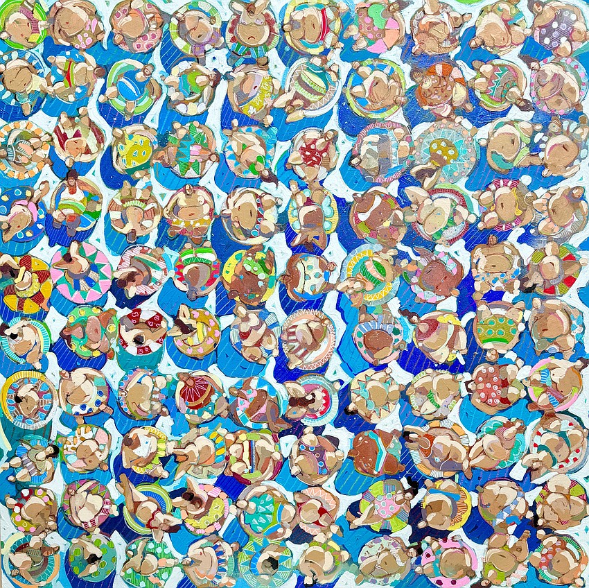 Tim Jaeger’s acrylic-on-canvas “Melon Moods” (2025) is a bird’s eye view of 100 individuals in pool floats. They’re lined up like human melons in a 10-by-10 grid in an Olympic-sized pool. Utterly relaxed, despite being packed tightly together. It’s a witty image of all-American downtime.