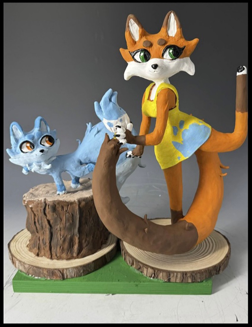 This juried exhibition opens a portal to imaginative worlds and their inhabitants — elves, fairies, wizards, demons, man-eating plants, chimera, dragons, you name it. 3-D design students brought them to life. Developing heroes, sidekicks and villains was the assignment. Not just creating fantasy sculptures. Building the worlds and backstories behind these characters. The storytelling students delivered. My favorite is the winsome elf girl whose sidekick is a bee. They’re a wild pair. But they’re not alone.
