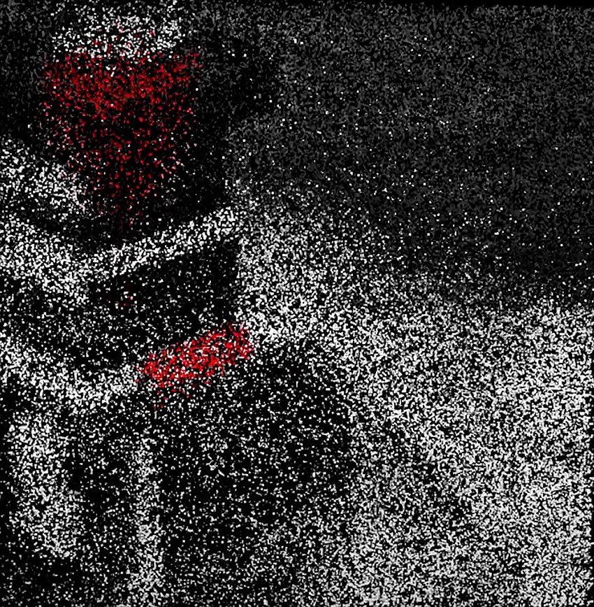 Joe Thiel’s digital print “Untitled” (2025) is a study in contrasts. A stylized, left profile of an African-American man faces the light. His skin tone is deep indigo. Illuminated areas of hair and skin are geometric facets; grainy stippling creates the mid-tones; the shadows are jet black with zero detail. The profile’s borders are angular, like a paper cut-out. A strong personality shines through — along with a sense of mystery. The man is visible, but not transparent. This is a painting, not an X-ray.
