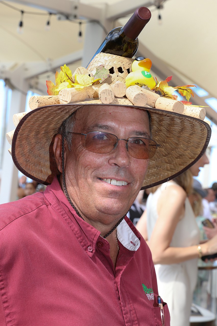 David Harmon attends Pique Nique and serves wine from his California vineyard. His fascinator pays homage to his pet duck who just passed away.