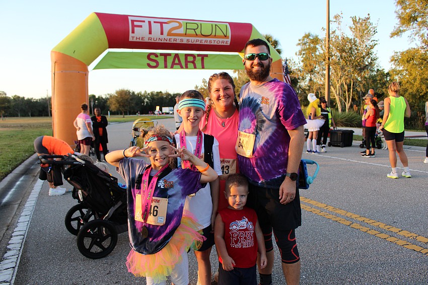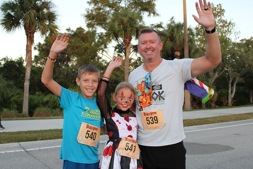 Sarasota's Charlie LeClere, Cora LeClere and their dad Cory LeClere prepare to run the 5k race. Charlie got third place in the male 0-12 age range category and Cora did the same in the female category.