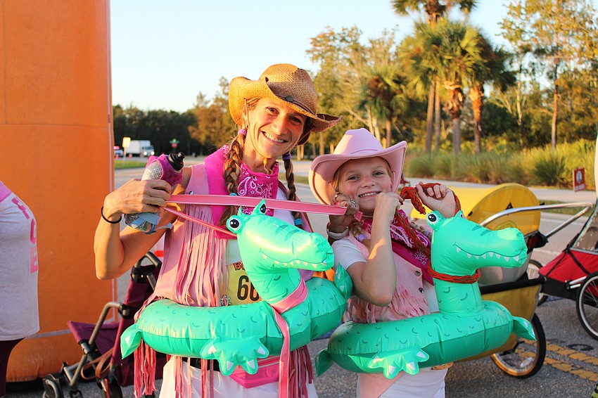 Sarasota's Krista Dowdell and her daughter Desirae Dowdell, 11, decide to represent Florida by adding alligator inflatables to their cowgirls costumes.