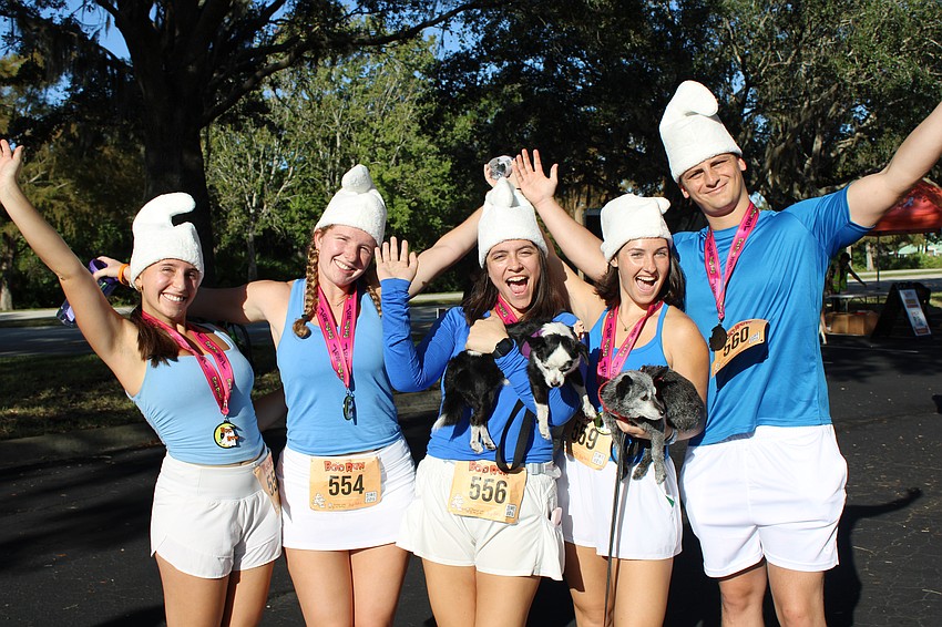 Avery Meier, Lauren Becky, Paige Zolecki, Emma Tullio (twin of Grayson Tullio) and Dylan Werle dress as Smurfs for the 22nd Annual Boo Run in Lakewood Ranch.