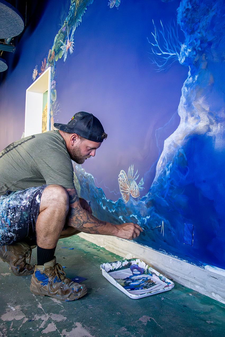 It's the only mural at the aquarium where the visitors will have full access to the mural. They will be able to see the imperfections, but he said they can also see how he doesn't clean his brush off when he continues painting with that particular color, causing a subtle change in the color shade, and creating a flow.