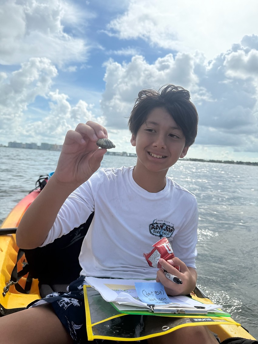 Connor Craig, who volunteered with his dad, Curtis, holds up a scallop the pair found during the Great Scallop Search of 2025 in Sarasota Bay.
