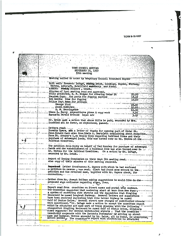 “The Committee suggested that numbering start at zero from New Pass, a system of numbering side streets, and the suggestion the Ringling Boulevard be named Longboat Parkway. Several letters and suggestions have been received suggesting that this latter highway be named Gulf of Mexico Drive,” the minutes state. “Mr. (Wilfred) LePage made a motion to accept the committee report, which is attached and made a part of these minutes, with the following changes: that Ringling Boulevard be named Gulf of Mexico Drive, eliminate names suggested for several undedicated streets.”