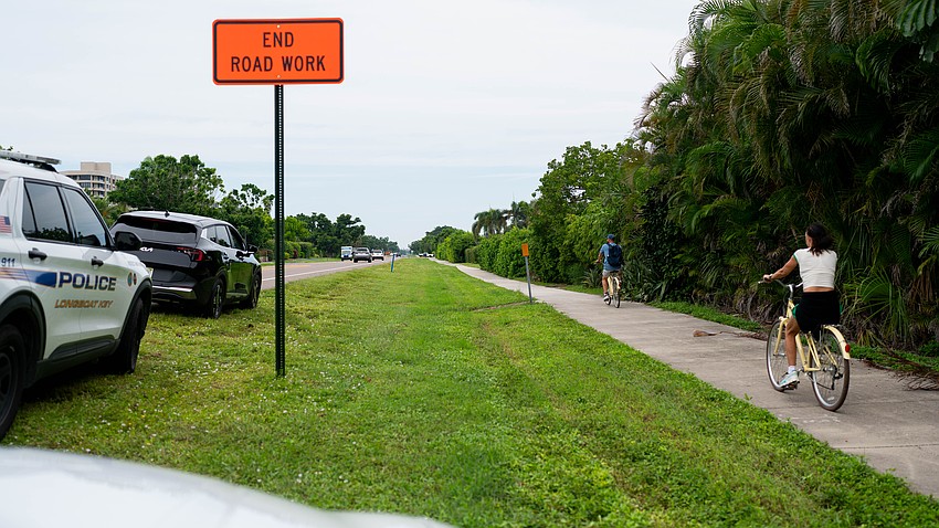 Cyclists ride past a vehicle pulled over by police on Gulf of Mexico Drive Friday, Sept. 12. Longboat Key police patrolled the south side of the island on Gulf of Mexico Drive from the St. Regis Resort to Yawl Lane, about a mile in length, with an increased presence. Sgt. Sean Butler said cyclists are allowed to ride in the bike lane, on the road or on sidewalks, though riding in the street can lead to traffic congestion and become a hazard during busy times of the day. When a cyclist is traveling in the bike lane, drivers are legally required to leave 3 feet of space between their vehicle and the bicycle they are passing.