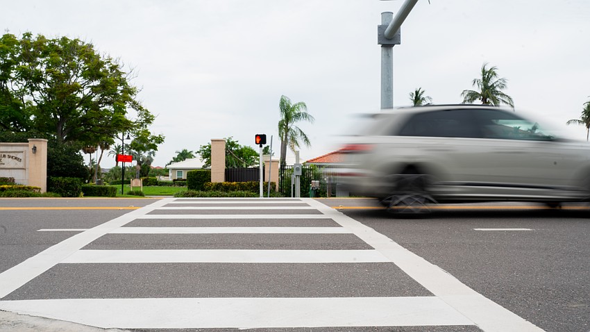 An SUV drives past a pedestrian crosswalk on Gulf of Mexico Drive. Longboat Key has several signaled crosswalks on Gulf of Mexico Drive for pedestrians and cyclists to cross. Sgt. Butler said the department monitors crosswalks to ensure drivers are obeying the law because “accidents with pedestrians and cyclists don’t typically end too well.” According to LKPD Sgt. Sean Butler, a one-time, $5,000 grant from FDOT funds 12 separate eight-hour overtime shifts for officers and that a typical high visibility enforcement shift adds about three to four police on the streets.