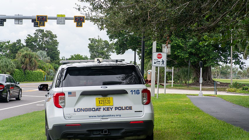 A Longboat Key Police Department cruiser is stationed at a pedestrian crosswalk on Gulf of Mexico Drive. Using Florida Department of Transportation grant money for the state‘s “high visibility enforcement” initiative, LKPD will have three to four additional patrol cars on the south end of the key. During the last eight-hour shift LKPD held with high visibility enforcement, officers conducted 37 traffic stops and issued eight citations.