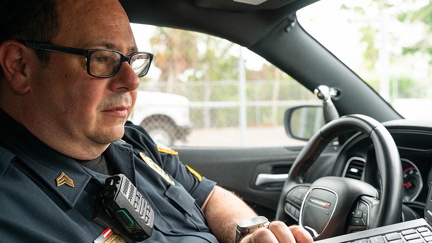 Sgt. Sean Butler checks his in-vehicle laptop, known as a mobile data terminal, outside of the LKPD precinct. Police cruisers have internet service and officers use their terminals to run vehicle license plates, check active calls for service, log traffic stops and connect with automatic license plate readers. Butler said an LKPD officer typically drives about 110 to 140 miles in their squad car per eight-hour shift.