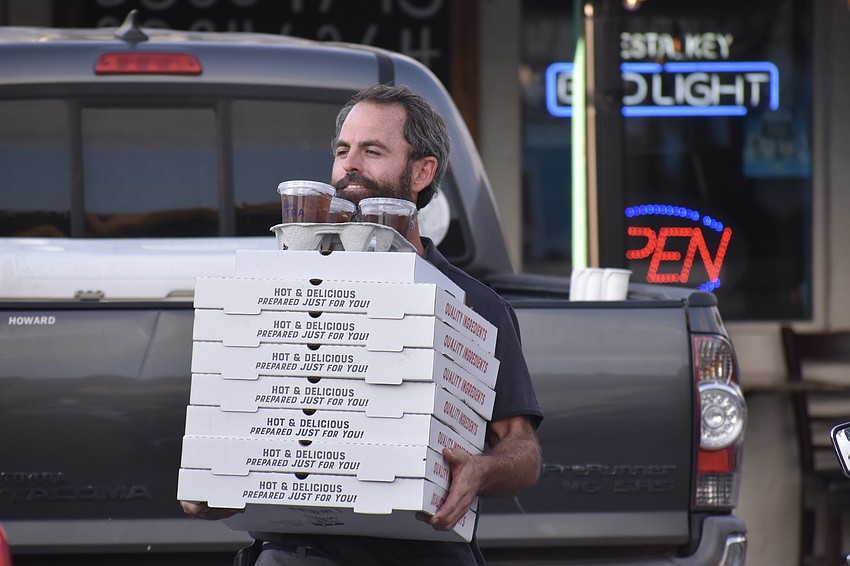 Andrew Ierardi walks away from The Blasé Café & Martini Bar with a stack of pizzas for a group at Freedom Christian Church.