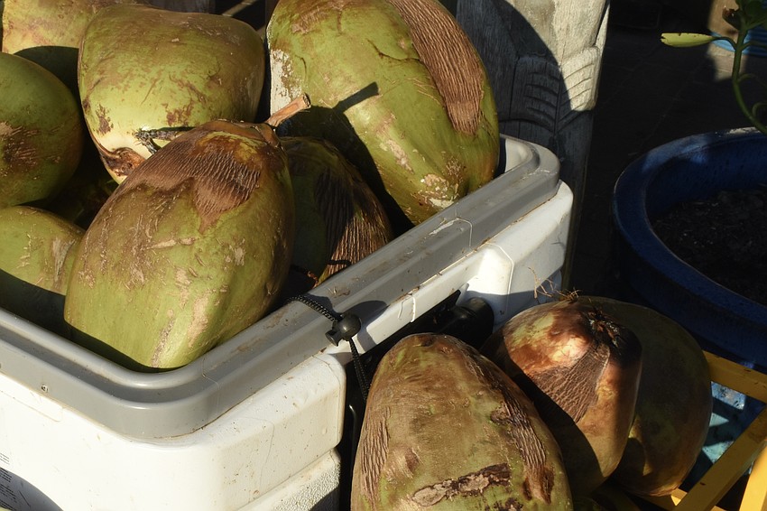 A wagon of coconuts sits in front of a Siesta Key restaurant.