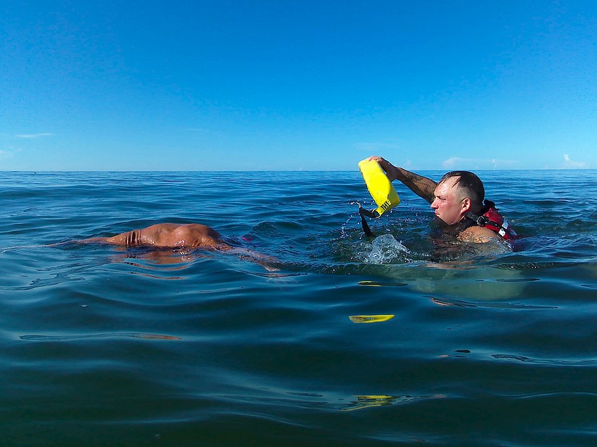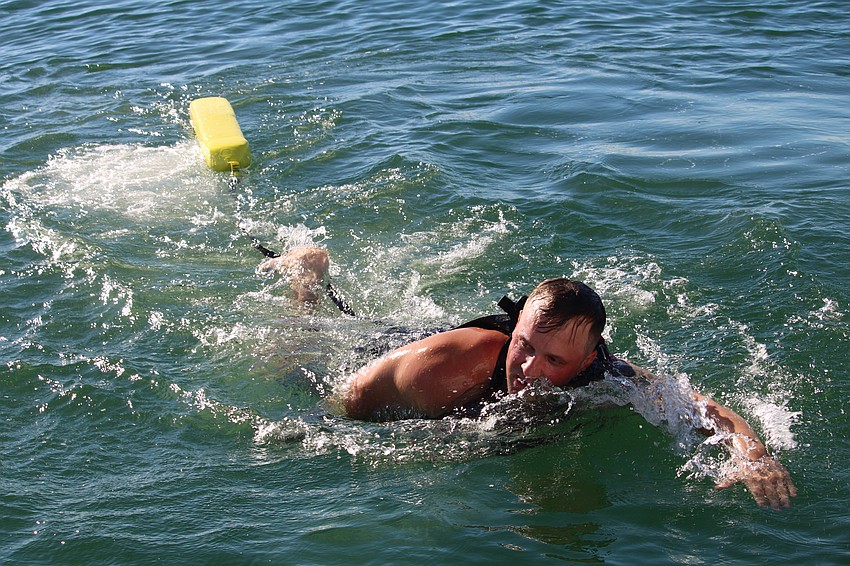 Longboat Key Fire Rescue Firefighter/Paramedic Derek Flaim practices diving while keeping his head above water as part of a marine rescue training.