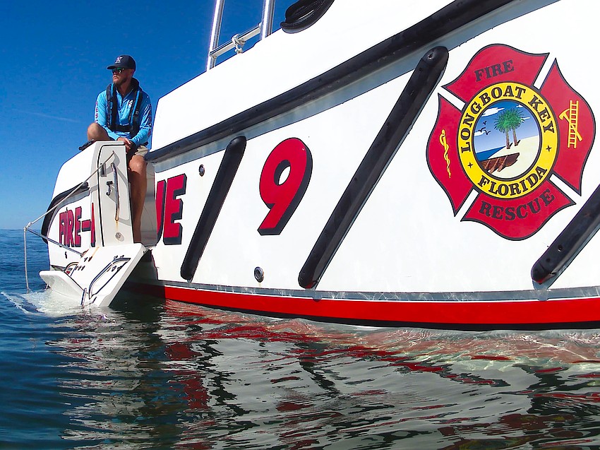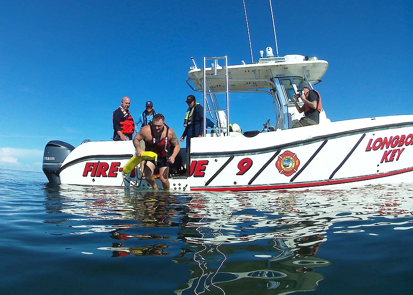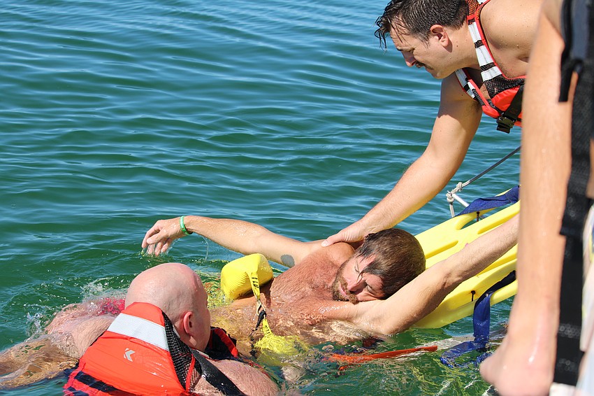 It's a team effort getting lifeguard Cliff Talbott onboard as he plays the role of an unconscious victim for a water training with Longboat Key Fire Rescue.