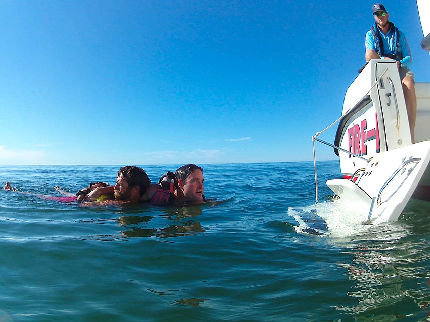 Longboat Key Fire Rescue firefighter/paramedic Aaron Maness pulls up lifeguard Cliff Talbott from Manatee County for a cross-department training, after firefighter/paramedic Chase Bullock swam the "unconscious" swimmer to the side of the rescue boat.